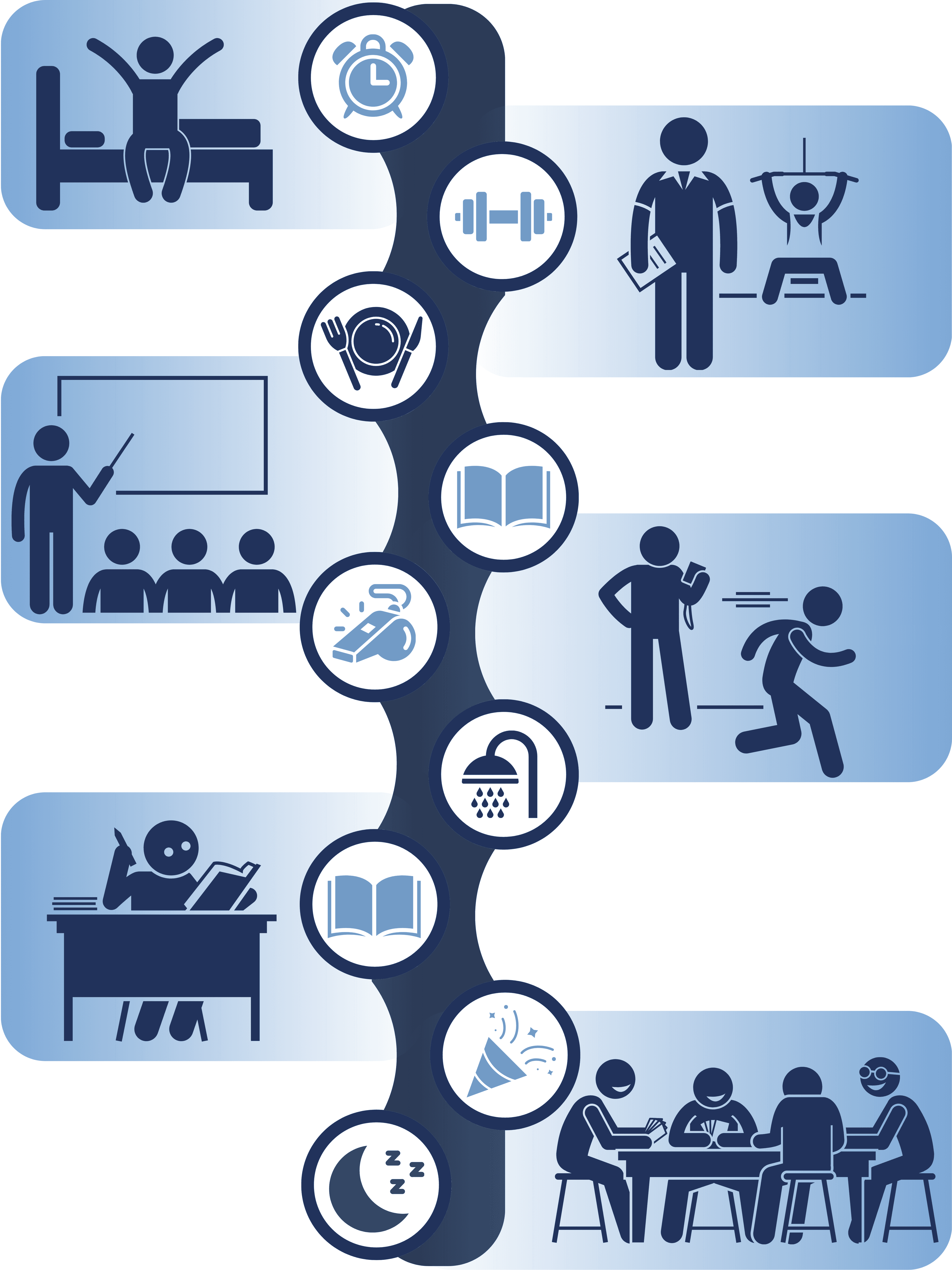 Depending on the time of the year, most student athletes start their day with morning practice, which means getting up early. These practices might include strength and conditioning workouts in the gym and typically last 1-2 hours. After the early workout or practice, athletes go to the cafeteria to eat breakfast, followed by classes, usually between 8:00 a.m. and noon. After that, it’s lunch time together in the dining hall with their teammates or other friends.